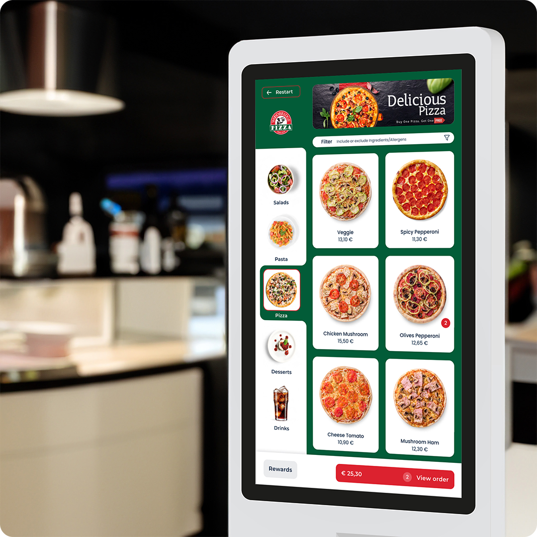 Délectez vos clients et augmentez votre efficacité grâce à nos kiosques en libre-service et à notre système de commande en ligne, qui rendent votre service aussi rapide et agréable que vos pizzas