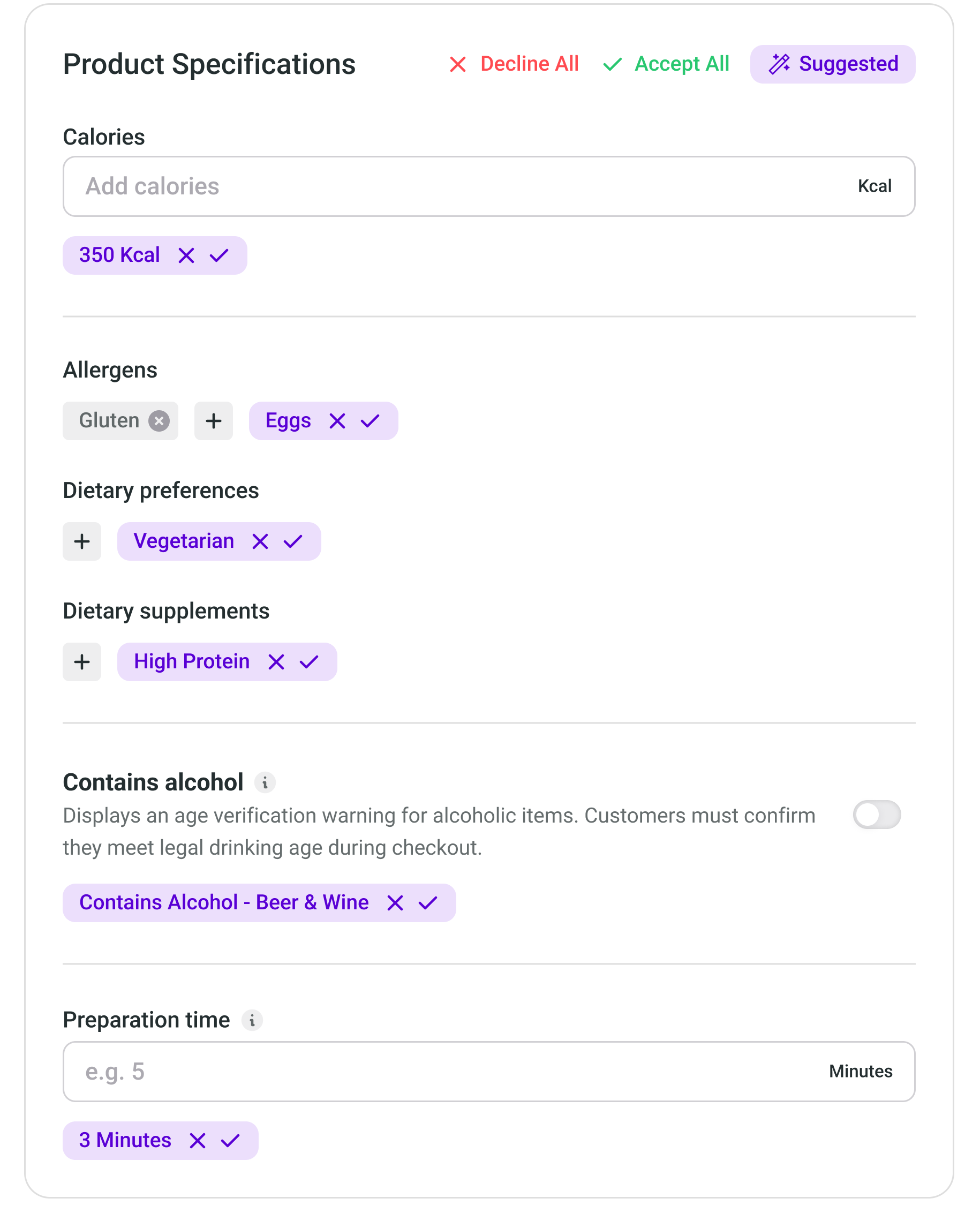 Automatically suggested allergens, dietary preferences, calories, and more for every item