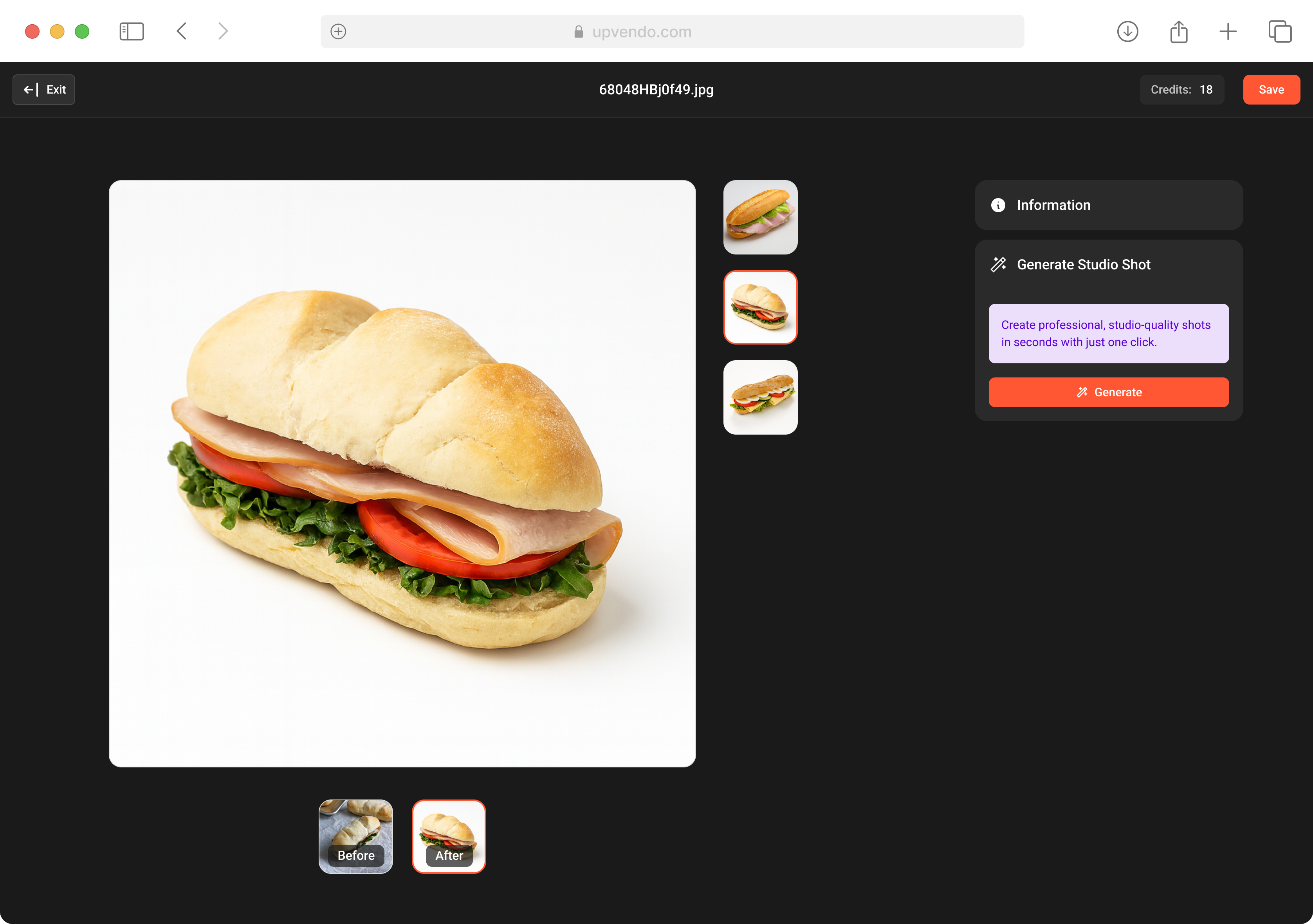 Upvendo Photo Studio uses advanced AI technology to automatically refine every aspect of your photos, from lighting adjustments to background removal, ensuring each image looks professional and consistent.