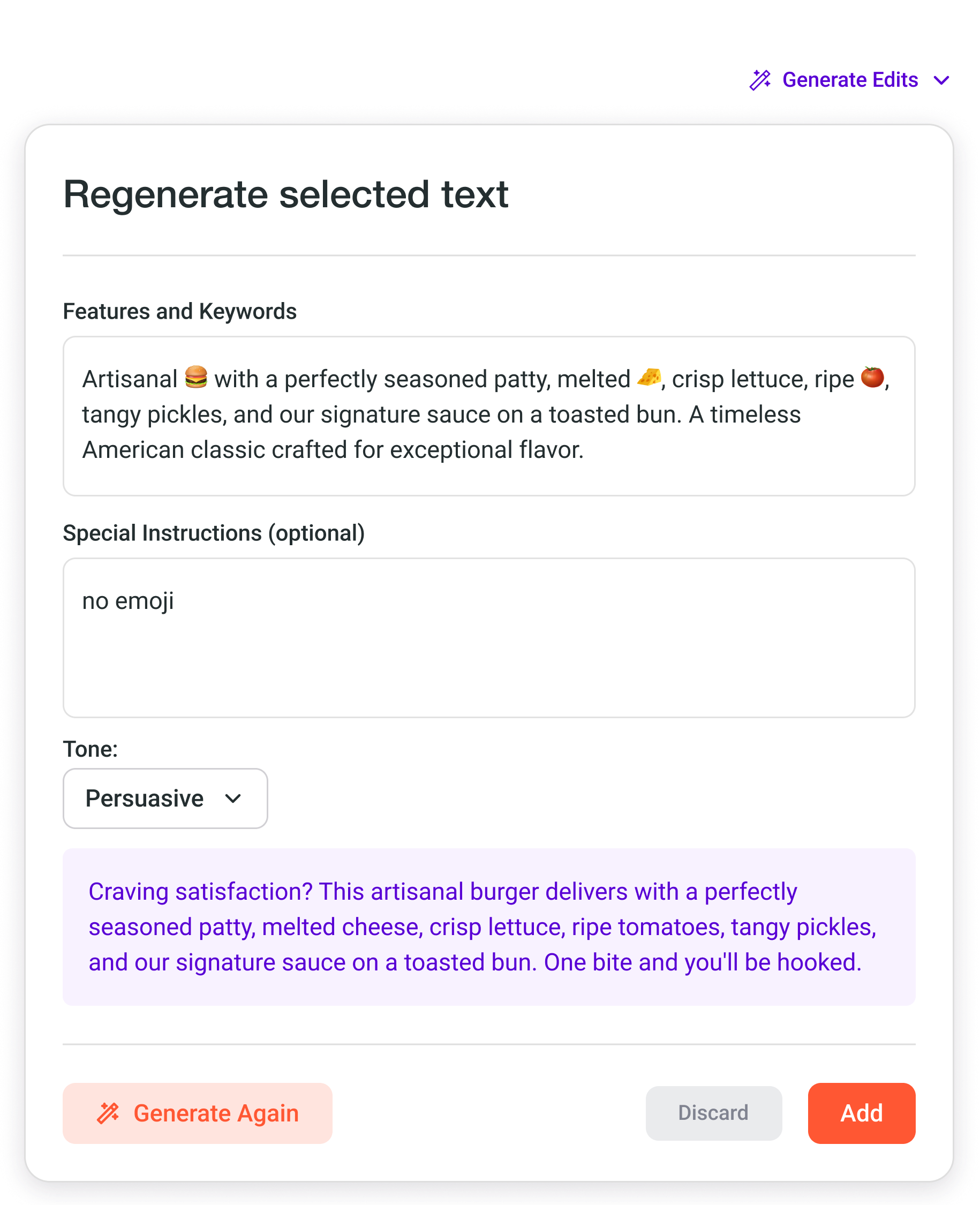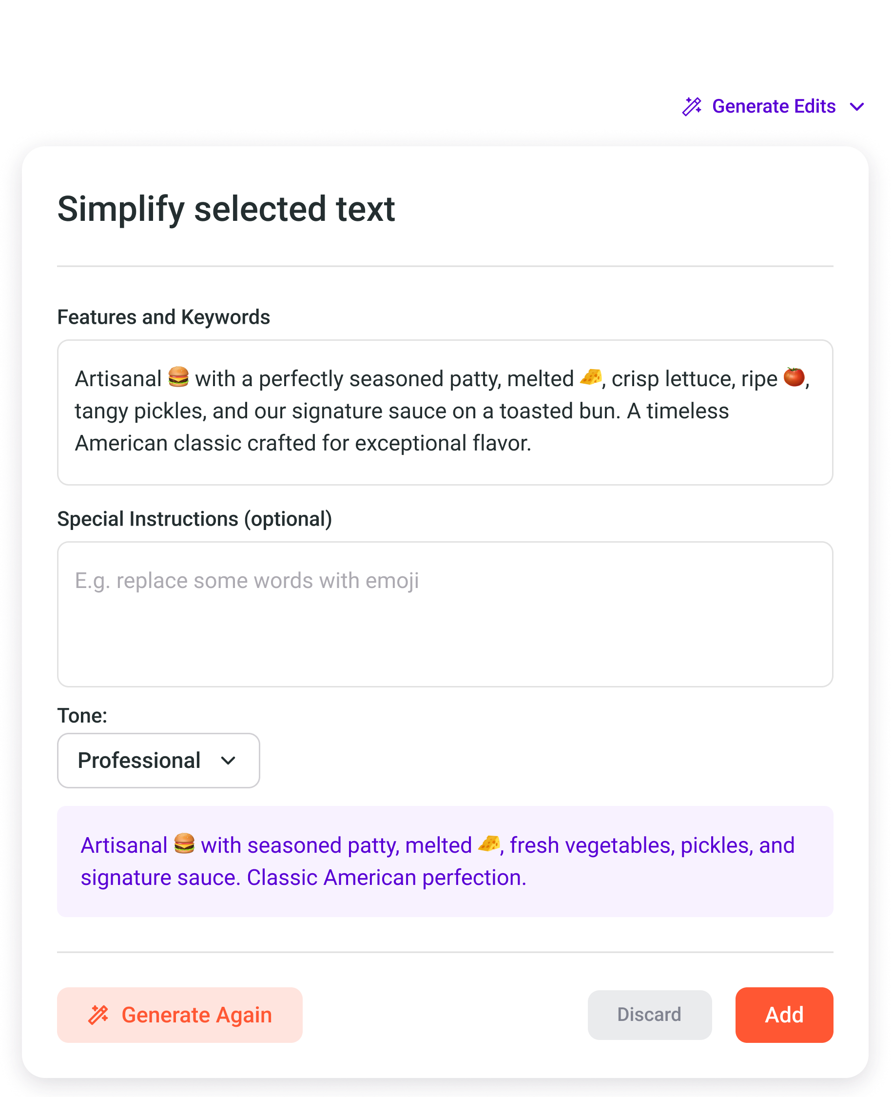 Refine any description, whether created with Upvendo Magic or your own, into compelling copy that drives orders. Simplify lengthy text, extend brief descriptions, or regenerate entirely to create the perfect message for your customers